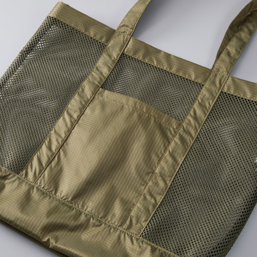 リップストップ生地と、メッシュの組み合わせ、肩掛けしやすい長さのハンドルがデイリーユースにぴったりのトートバッグです。マチ幅がしっかりとあり、A4サイズのものをざっくりとしまえるサイズ感が魅力。
