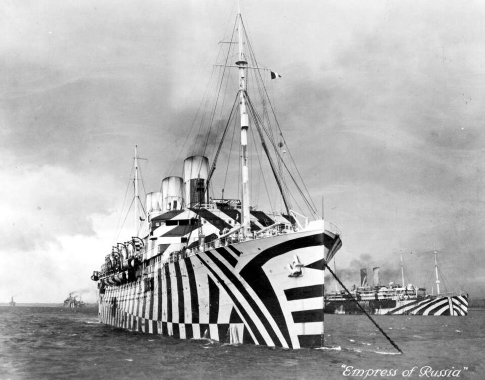 (ダズル迷彩を施された輸送船エンプレス・オブ・ロシア。Wikimedia commons)