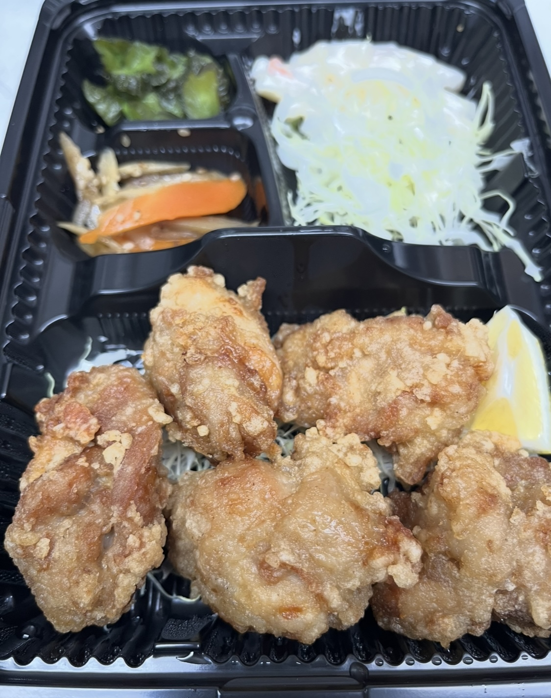 550円(税込)でジューシーな唐揚げが5個・きんぴらごぼう・キャベツとマカロニのサラダ、漬物も入っている美味しくて満足感の高いお弁当です!