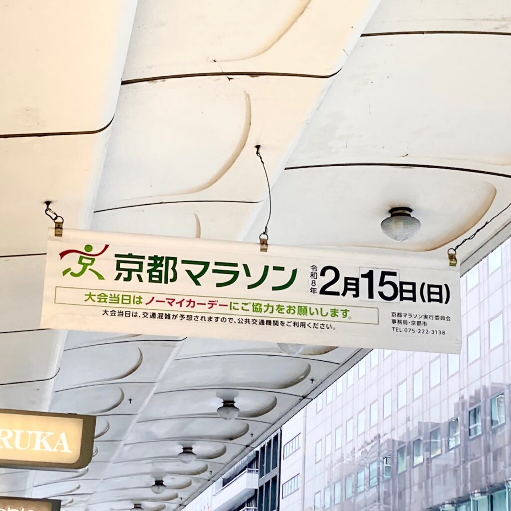 週末、京都もマラソンがあると案内出ていたけどいつだったかなと看板を見たら、今週末!?とびっくり。