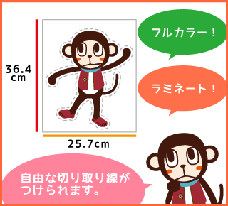 シールのサイズは、B4サイズ(25.7cm×36.4cm)までプリント可能です。この範囲内に切り取り線をつけて、シール1シートが完成します。